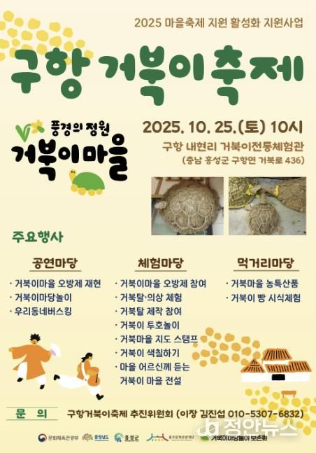 정안뉴스 황도연 기자 | (재)홍주문화관광재단 문화도시센터는 ‘마을 축제 지원 및 활성화 사업’의 일환으로 오는 25일 오전 10시부터 오후 4시까지, 충남 홍성군 구항면 거북로 436 일원에서 ‘구항 거북이 축제’를 개최한다.