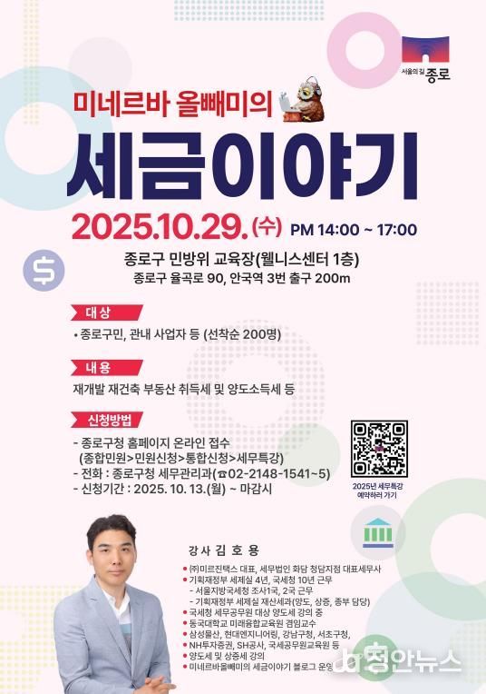 정안뉴스 안정주 기자 | 종로구가 오는 10월 29일, 오후 2시부터 5시까지 웰니스센터 1층 종로구 민방위교육장(율곡로 89)에서 '아는 만큼 덜 낸다' 구민 절세 특강을 개최한다.