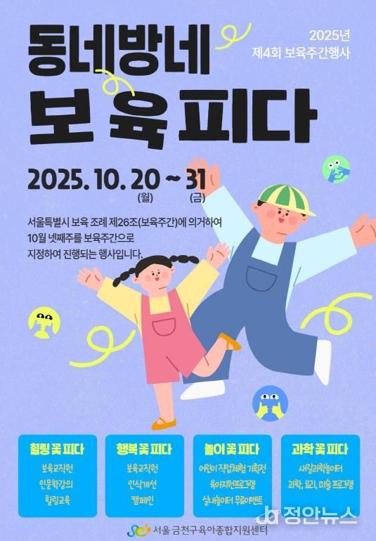 정안뉴스 안정주 기자 | 금천구는 20일부터 31일까지 금천구 곳곳에서 보육주간행사 ‘동네방네 보육피다’를 개최한다고 밝혔다.