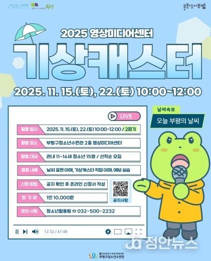 정안뉴스 안정주 기자 | 부평구 청소년수련관이 ‘기상캐스터 직업 특강’에 참여할 청소년을 모집한다.