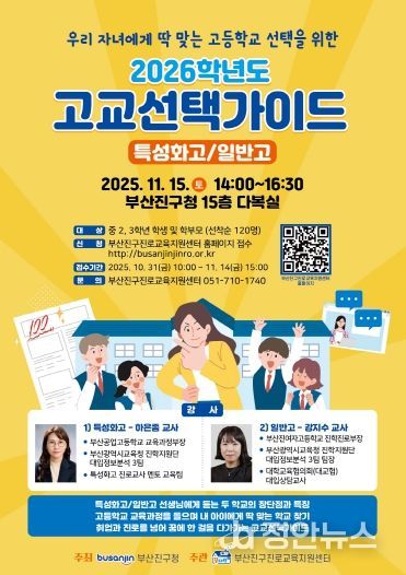 정안뉴스 황정혜 기자 | 부산 부산진구는 11월 15일 토요일 오후 2시 구청 15층 다복실에서 ‘2026학년도 고교선택가이드 현장 설명회’를 개최한다고 밝혔다.