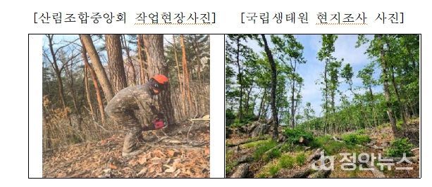 또한, 작업현장 사진과 현지조사 사진을 비교한 결과, 큰나무 위주의 간벌로 인해 식생이 단순화되고 산림 구조가 훼손된 정황이 확인됐다.