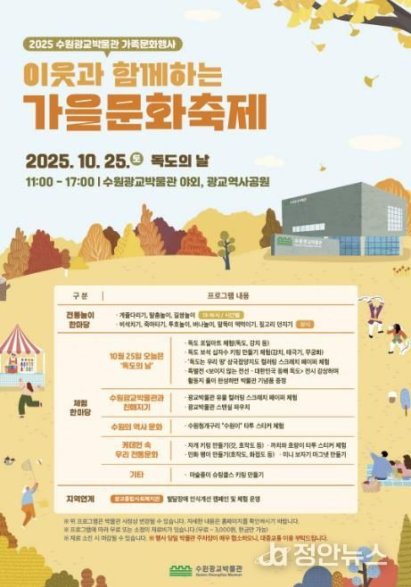 정안뉴스 안정주 기자 | 수원광교박물관은 독도의 날인 10월 25일 오전 11시부터 오후 5시까지 수원광교박물관 야외(광교역사공원)에서 ‘2025 수원광교박물관 가족문화행사–이웃과 함께하는 가을문화축제’를 연다.