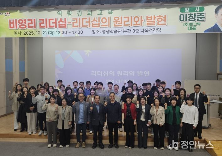 정안뉴스 안정주 기자 | 남원시는 10월 21일 오후 1시 30분부터 평생학습관 3층 다목적 강당에서 민간사회복지 종사자 70여명이 참석한 가운데 '비영리 리더십 – 리더십의 원리와 발현'을 주제로 2025년 민간사회복지사 역량강화교육 5회차 마지막 교육을 성황리에 마쳤다.