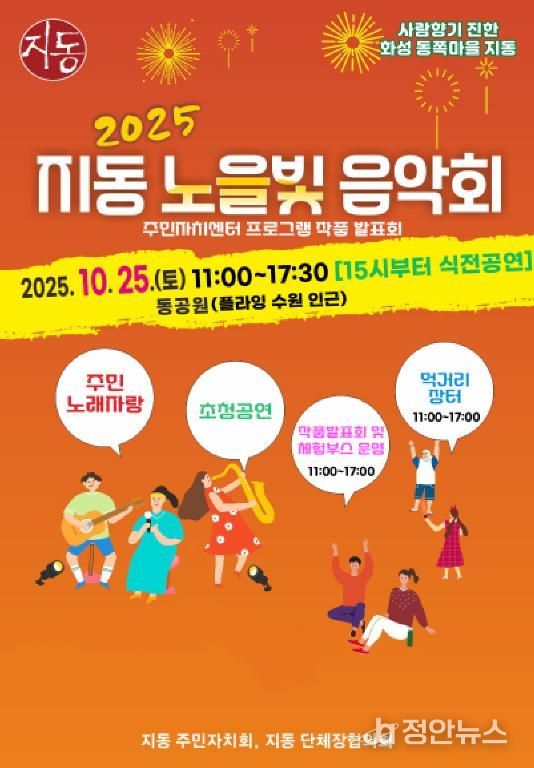 정안뉴스 안정주 기자 | 오는 10월 25일, 수원시 팔달구 지동 동공원(지동 267-12)에서 활력 넘치는 가을날을 아름다운 음악과 주민들의 열정으로 채울 특별한 축제, ‘2025 지동 노을빛 음악회·주민자치센터 작품발표회’가 열린다.