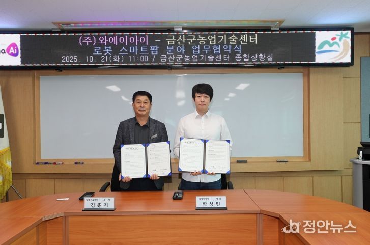 정안뉴스 황도연 기자 | 금산군농업기술센터와 인공지능 로봇 개발 기업 ㈜와에이아이는 지난 21일 센터 종합상황실에서 잎들깨 전용 지능형 수확로봇 개발과 스마트팜 기술 고도화 업무협약을 체결했다.