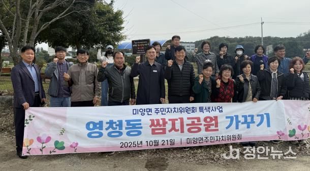 정안뉴스 안정주 기자 | 지난 10월 21일 미양면 영청동 쌈지공원에서 주민자치위원회가 영청동 쌈지공원 현판식을 개최했다.