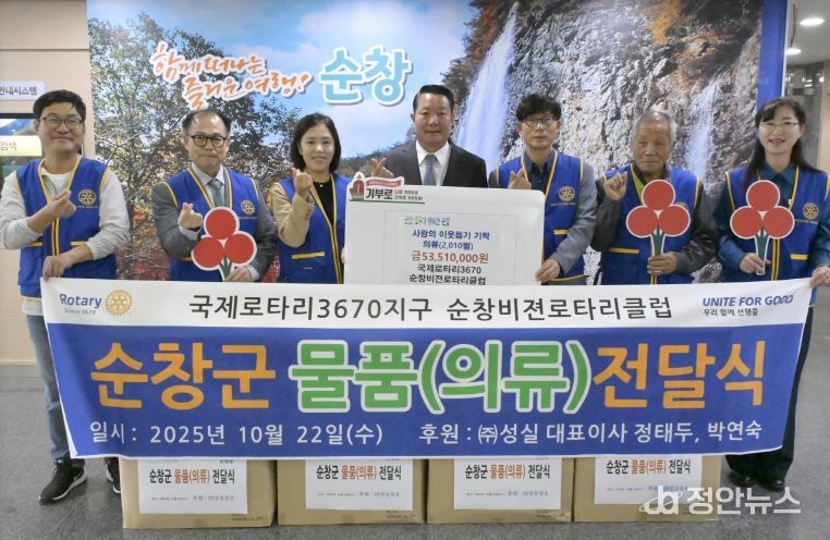정안뉴스 안정주 기자 | 국제로타리 3670지구 순창비전로타리클럽(회장 김광진)은 유·아동 및 성인 내의류 전문 생산업체인 ㈜성실로부터 총 2,010벌(시가 약 5,300만 원 상당)의 의류를 후원받아 순창군청에 기탁했다.