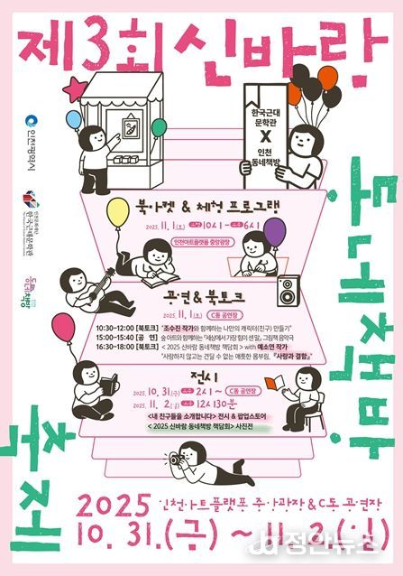 정안뉴스 안정주 기자 | 인천문화재단 한국근대문학관은 오는 10월 31일부터 11월 2일까지 인천아트플랫폼 중앙광장과 C동 공연장에서 〈2025 신바람 동네책방 축제〉를 개최한다.