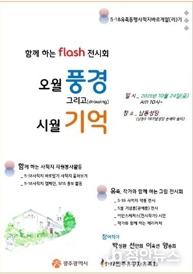 정안뉴스 안정주 기자 | 광주광역시는 5·18민주유공자유족회와 함께 24일 동구 남동5·18기념성당에서 시민과 함께하는 ‘오월 풍경 그리고(drawing) 시월 기억’ 전시회를 개최한다.