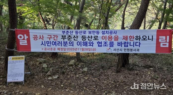 정안뉴스 황도연 기자 | 충남 서산시가 부춘산 등산로의 야간 안전을 개선하기 위해 부춘산 등산로 내 보안등 설치 공사를 실시한다고 24일 밝혔다.