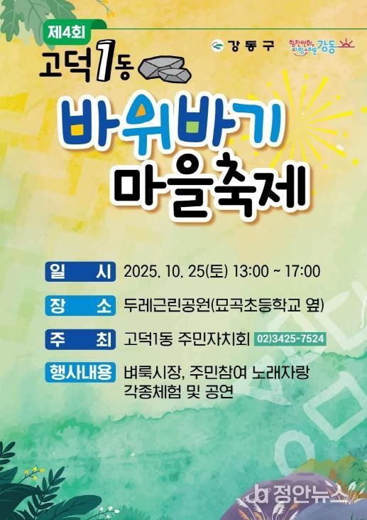정안뉴스 안정주 기자 | 강동구 고덕1동은 오는 25일 두레근린공원(고덕동 497)에서 주민 화합의 한 마당인 '제4회 고덕1동 바위바기마을축제'를 개최한다고 밝혔다.