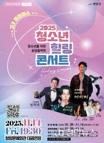 정안뉴스 황도연 기자 | 청양군은 오는 11월 14일 저녁 7시 30분, 청양문예회관 대공연장에서 ‘2025 청소년 힐링콘서트’를 개최한다고 밝혔다.