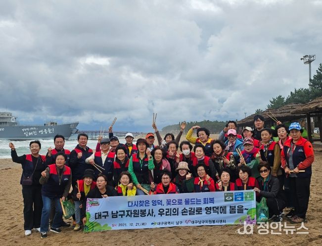 정안뉴스 안정주 기자 | 대구 남구는 지난 10월 21일 대구남구자원봉사센터와 함께 자원봉사자 40명이 올해 3월 대형 산불 피해를 겪은 경북 영덕지역에서 재난대응 중심 봉사활동을 펼쳤다.