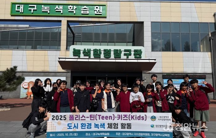 정안뉴스 안정주 기자 | 대구광역시 자치경찰위원회는 10월 25일, 대구녹색학습원에서 ‘폴리스‑틴(Teen)·키즈(Kids)’ 5기 회원 59명을 대상으로 ‘도시환경 녹색 체험활동’ 프로그램을 운영했다.