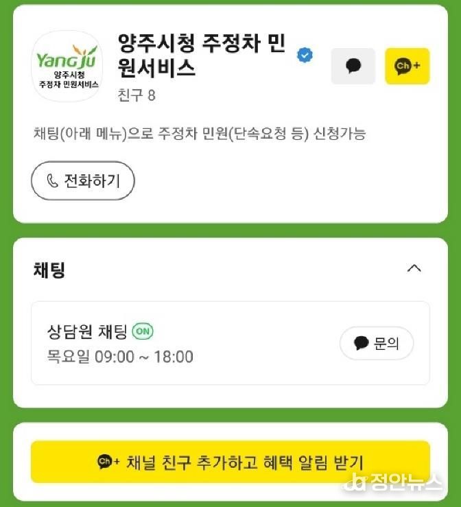 정안뉴스 안정주 기자 | 양주시가 시민의 주정차 관련 민원 편의를 높이고 소통을 강화하기 위해 ‘양주시 주정차 민원서비스’카카오톡 채널을 정식 개설하고 운영한다.