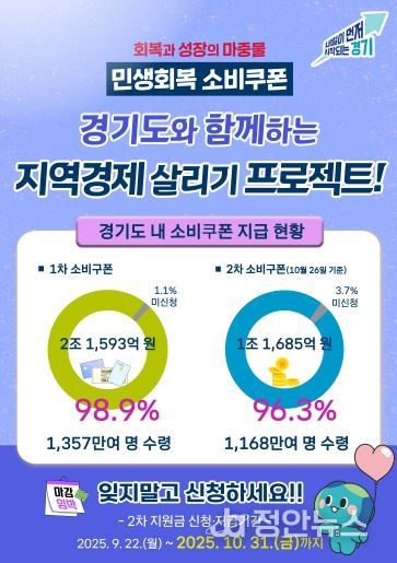 한편 경기도의 지난 1차 소비쿠폰의 지급률은 98.9%로 1,357만여 명이 소비쿠폰 2조 1,593억 원을 수령한 바 있으며, 26일 현재 1차와 2차를 거쳐 지급된 소비쿠폰(약 3조 3,275억 원)의 91.5%가 사용된 것으로 나타났다.