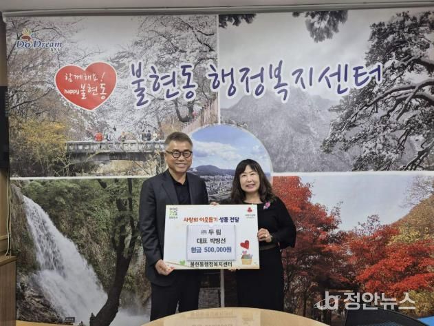 김영미 불현동장은 “따뜻한 나눔을 실천해 주신 박병선 대표님께 감사드리며, 기탁하신 성금이 도움이 필요한 가정에 잘 전달될 수 있도록 최선을 다하겠다”라고 전했다.