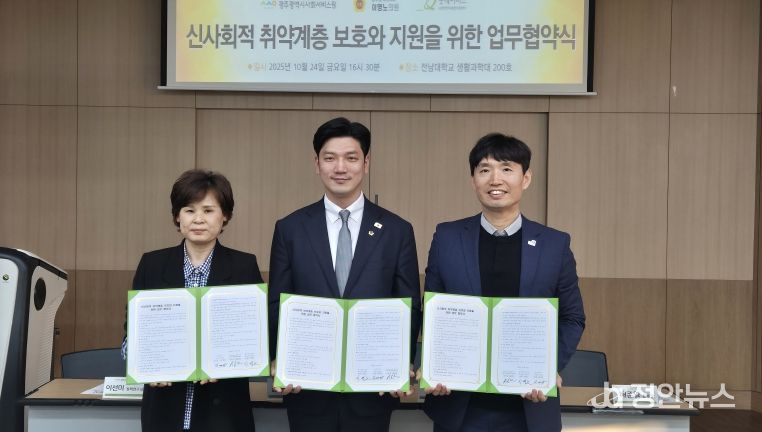 정안뉴스 안정주 기자 | 굿네이버스 광주지부(본부장 겸 사회적약자통합지원센터장 배준열)는 광주광역시의회 환경복지위원회 이명노(더불어민주당·서구3) 의원실, 광주광역시사회서비스원(원장 김대삼)과 함께 신사회적 취약계층 보호와 지원 강화를 위한 업무 협약식을 24일 진행했다고 밝혔다.