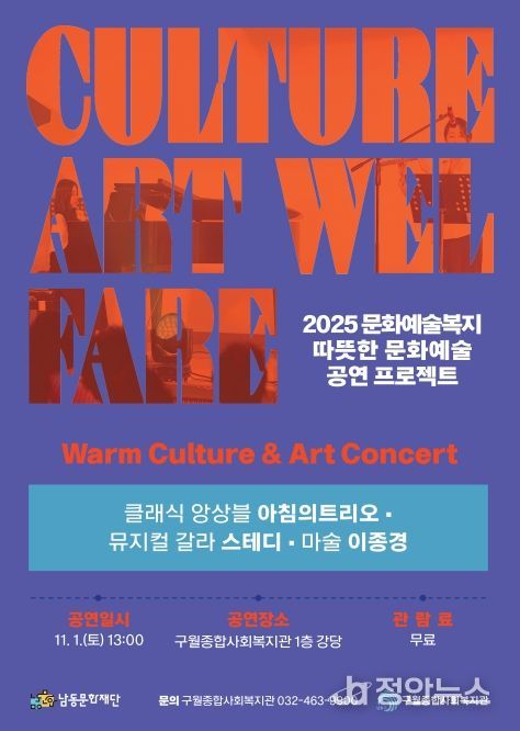 정안뉴스 안정주 기자 | 인천시 남동구 남동문화재단은 구월종합사회복지관과 협력해 오는 11월 1일 오후 1시부터 구월종합사회복지관 1층 강당에서 가족 특화 문화예술복지 공연을 운영한다고 30일 밝혔다.