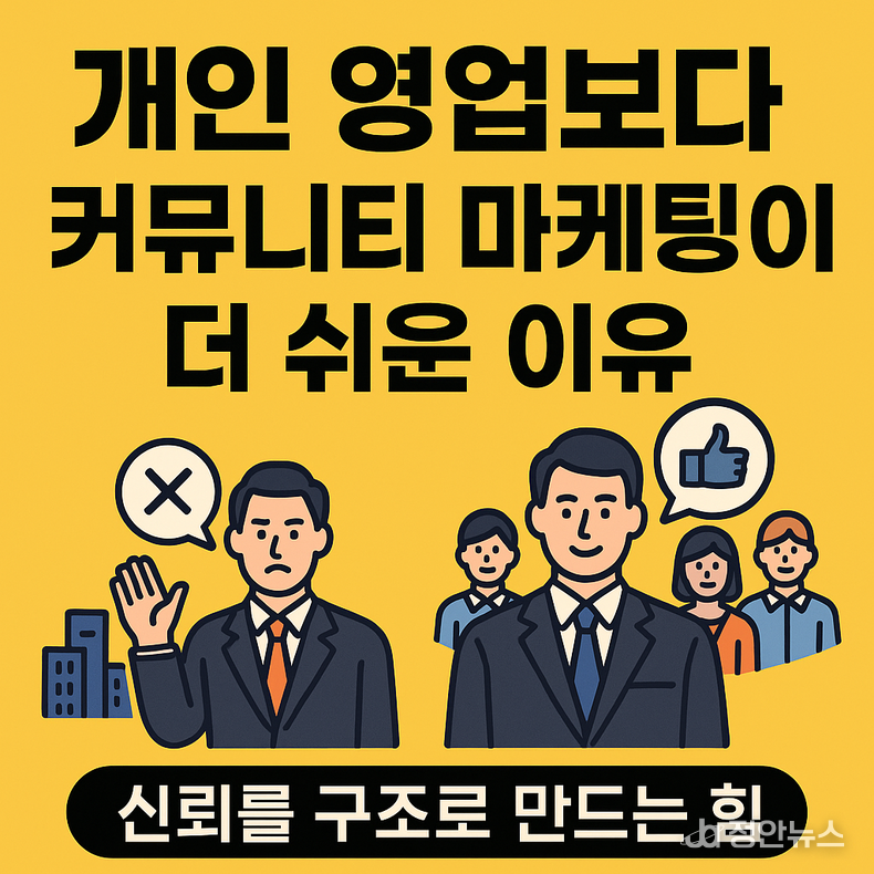 전통적인 개인 영업은 신뢰를 처음부터 쌓아야 하는 구조다. 제품이나 서비스를 아무리 잘 만들어도, ‘누가 말하느냐’에 따라 결과는 달라진다. 하지만 커뮤니티 마케팅에서는 개인이 아닌 ‘집단의 신뢰’가 작동한다. 한 관계자는 “커뮤니티 안에서는 이미 공감대와 소속감이 형성돼 있어, 처음 만나는 사람에게도 신뢰가 빠르게 전달된다”며 “결국 개인이 아닌 공동체가 신뢰의 출발점이 된다”고 설명했다.