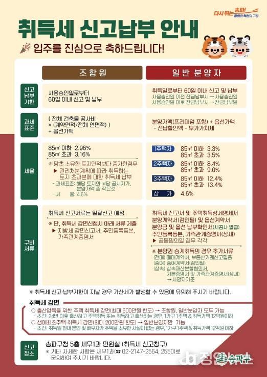 정안뉴스 안정주 기자 | 다가오는 잠실 일대 대규모 신축 아파트 입주에 대비해, 서울 송파구가 이달 5일부터 아파트 조합원과 수분양자를 대상으로 취득세 자진신고 납부 안내문을 발송한다고 알렸다.