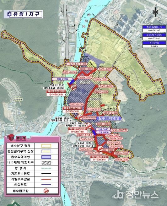 하수도정비 중점관리지역으로 지정된 ‘유림1지구 및 중앙지구’의 면적은 약 1.08㎢다. 이 지역은 하수관로의 통수 능력이 부족하고, 하천 수위가 상승할 경우 내수 배제가 어려운 지역으로 꼽혔다.