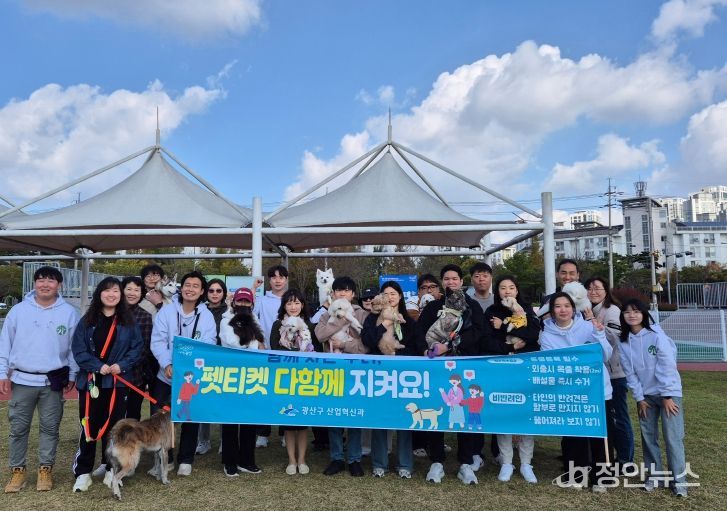 정안뉴스 안정주 기자 | 광주 광산구가 지난 1일 황룡친수공원에서 반려인들을 주체로 한 ‘반려문화 확산 펫티켓(반려동물 공공 예절) 캠페인’을 진행했다.