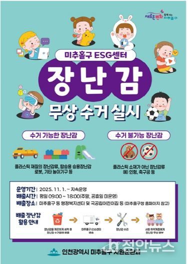 정안뉴스 안정주 기자 | 인천 미추홀구시설관리공단(이사장 박종구)은 구(區) 자원순환과가 주관하는 ‘장난감 무상 수거 및 수리 사업’에 동참한다고 3일 밝혔다.