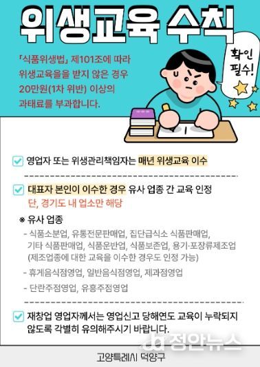 정안뉴스 안정주 기자 | 고양특례시 덕양구는 11월 한 달간 관내 식품접객업소를 대상으로‘위생교육 집중 독려기간’을 운영하며, 업소 위생 수준 향상과 교육 이수율 제고에 나선다.