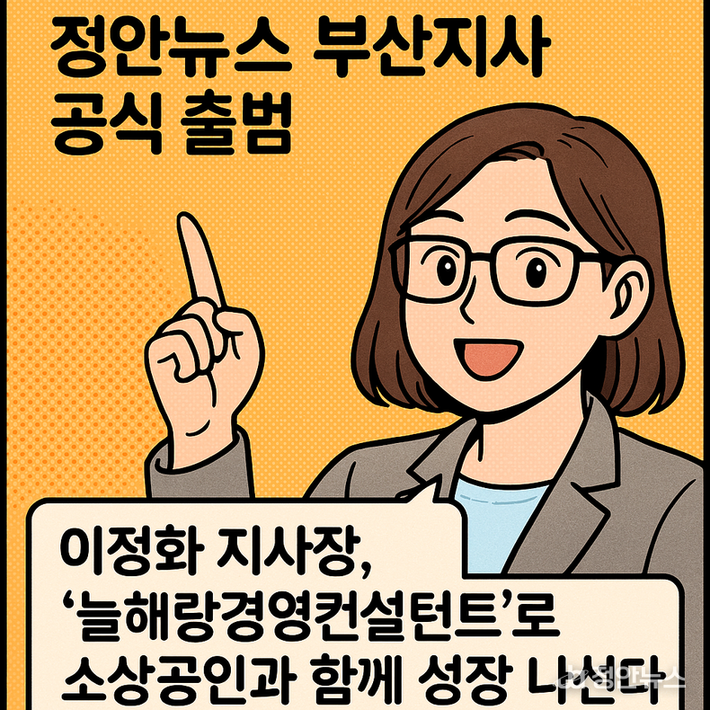 정안뉴스 부산지사가 공식 출범했다. 이번에 부산지사장으로 위촉된 이정화 지사장은 ‘늘해랑경영컨설턴트’로 활동하며, 소상공인과 지역경제의 상생을 위해 언론과 경영 현장을 잇는 새로운 역할을 맡게 되었다.