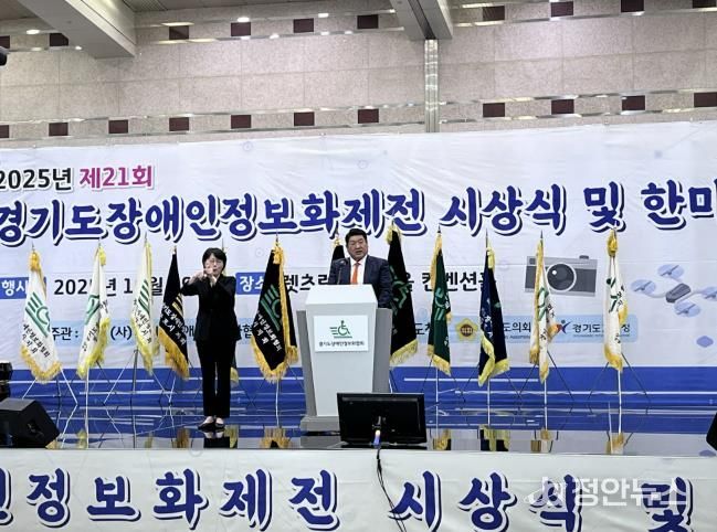 정안뉴스 안정주 기자 | 경기도장애인정보화협회는10월29일 오전11시 렛츠런파크 서울 컨벤션홀 에서‘제21회 경기도장애인정보화제전 및 한마음축제’를 성황리에 개최했다. 이번 행사는 경기도청, 경기도의회, 경기도교육청의 후원으로 열렸으며, 협회 산하18개 시·군지회 회원과 장애인 참가자, 자원봉사자 등1,000여명이 참석해 정보와 문화가 어우러진 포용의 축제를 펼쳤다.