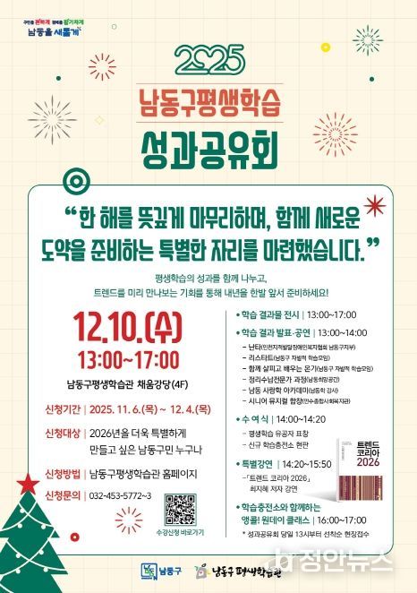 이번 성과공유회는 12월 10일 오후 1시부터 5시까지 남동구 평생학습관 채움강당에서 개최되며, 수강신청은 11월 6일부터 12월 4일까지 평생학습관 홈페이지를 통해 선착순으로 진행된다.