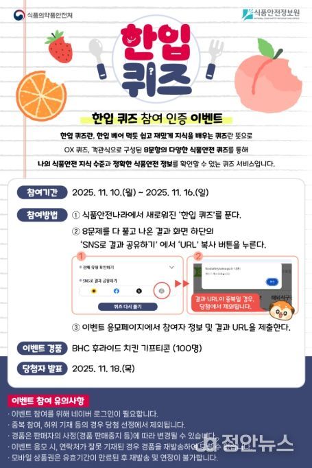 정안뉴스 안정주 기자 | 식품의약품안전처와 식품안전정보원은 국민이 식품 안전 정보를 쉽고 재밌게 알 수 있도록 식품안전나라의 퀴즈 서비스인 ‘한입 퀴즈’를 11월 10일부터 제공한다고 밝혔다.