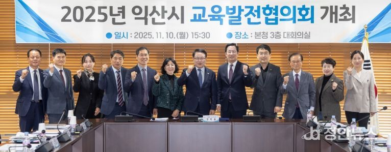 익산시는 10일 시청 대회의실에서 '익산시 교육발전협의회'를 개최했다. 이날 회의에는 정헌율 익산시장과 정성환 익산교육지원청 교육장을 비롯해 시의원, 교수, 학교장, 학부모 등이 참석했다.