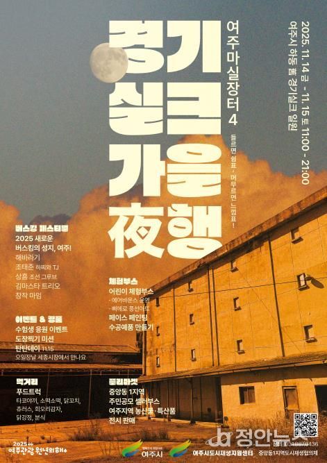 정안뉴스 안정주 기자 | 여주시는 오는 11월 14일부터 15일까지 이틀간 여주 경기실크 일원(여주시 하동 123-6번지)에서 '여주마실장터4 가을야행'을 개최한다고 밝혔다. 이번 행사는 '2025 새로운 버스킹의 성지, 여주!'라는 슬로건 아래, 깊어가는 가을밤의 정취를 더할 버스킹 페스티벌과 함께 다채로운 마켓과 체험을 선보일 예정이다.