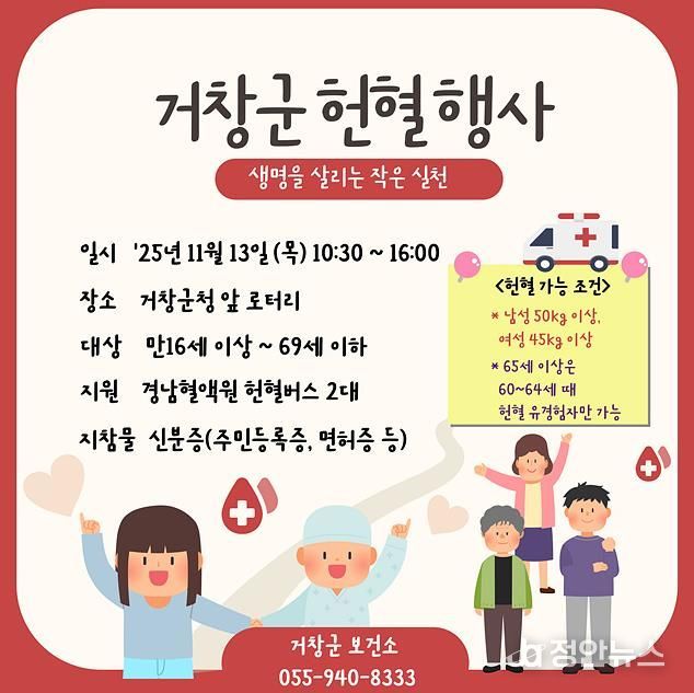 정안뉴스 김재홍 기자 | 거창군은 오는 13일 오전 10시 30분부터 오후 4시까지 거창군청 앞 로터리에서 ‘2025년 마지막 생명나눔 헌혈 행사’를 실시한다.