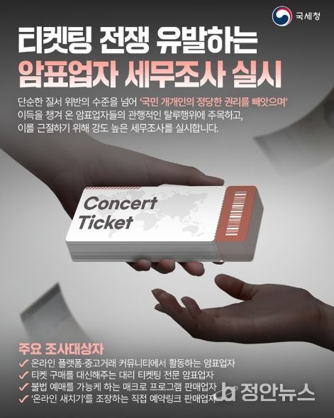 정안뉴스 안정주 기자 | 단순한 질서 위반의 수준을 넘어 '국민 개개인의 정당한 권리를 빼앗으며' 이득을 챙겨 온 암표업자들의 관행적인 탈루행위에 주목하고, 이를 근절하기 위해 강도 높은 세무조사를 실시합니다.