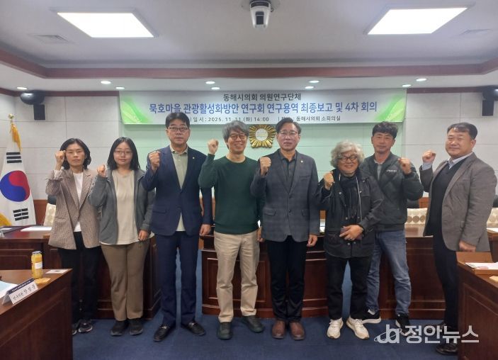 정안뉴스 안정주 기자 | 동해시의회 의원연구단체 '묵호마을 관광활성화방안 연구회'(대표의원: 정동수 의원)에서 동해시 묵호마을의 지역관광 활성화를 위한 연구용역 최종보고 및 4차 회의를 11일 동해시의회 2층 소회의실에서 개최하여 지역관광 발전을 위한 구체적인 방안을 모색하는 시간을 가졌다. 이번 회의에는 정동수 대표의원, 이형재 자문위원, 관련부서 팀장 등 11명이 참석하여 연구용역 최종보고를 청취하고 이에 대해 논의했다.