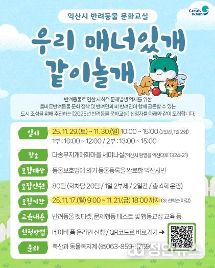 정안뉴스 안정주 기자 | 익산시가 올바른 반려동물 문화 확산을 위한 교육의 장을 연다.
