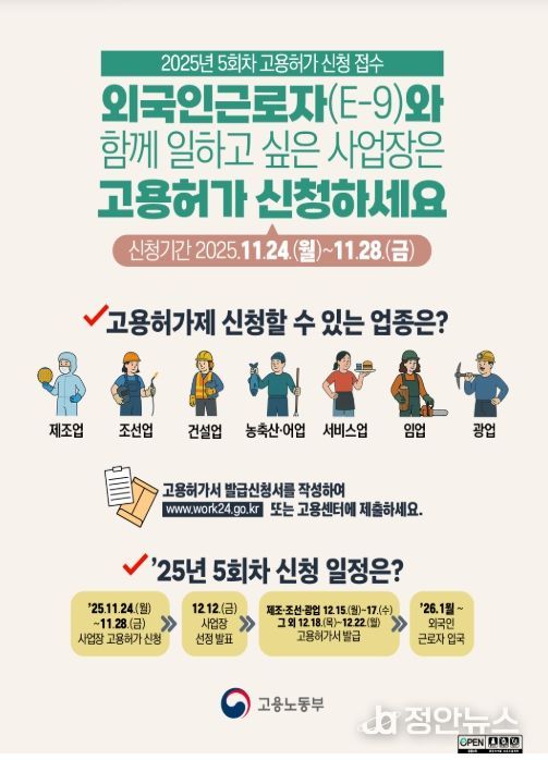 정안뉴스 안정주 기자 | 고용노동부는 11월 24일부터 11월 28일까지 전국 지방고용노동관서를 통해 외국인근로자(E-9)에 대한 올해 5회차 신규 고용허가 신청을 받는다.