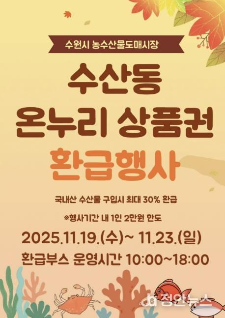 정안뉴스 안정주 기자 | 수원시농수산물도매시장 수산동이 11월 19일부터 23일까지 온누리상품권 환급 행사를 연다. 행사 기간에 국내산 수산물을 구매하면 최대 2만 원을 온누리상품권으로 환급받을 수 있다.