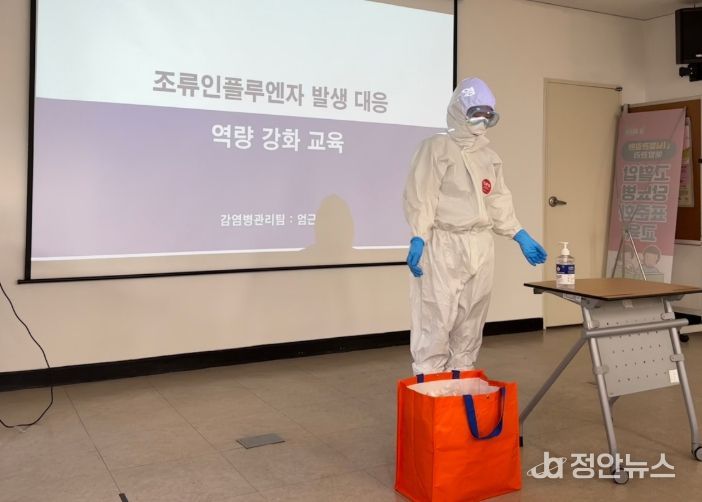 정안뉴스 안정주 기자 | 김포시보건소는 겨울 철새 유입으로 조류인플루엔자 발생에 따른 인체감염증 예방 및 신속대응을 위해 13일 감염병관리과 직원을 대상으로 보건교육실에서 모의훈련을 실시했다.