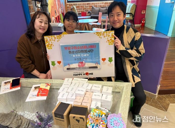 정안뉴스 안정주 기자 | 부평구 청소년꿈나래터는 지난 12일 소속 청소년자원봉사단 ‘청천히 다같이’가 ‘부평구 해피홈 보육원’을 방문해 직접 만든 천연 수제비누를 전달했다고 밝혔다.