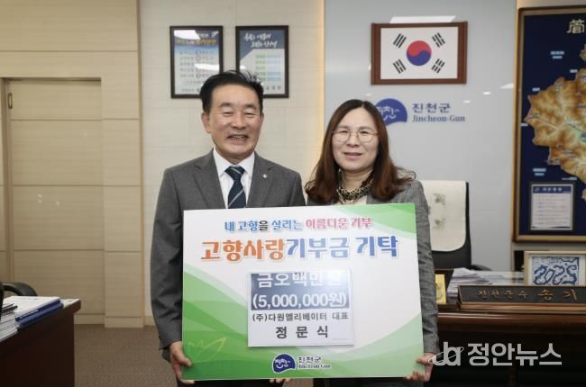 정안뉴스 황은경 기자 | 충북 진천군은 14일 다원엘리베이터(주) 정문식 대표와 입센몰 어성란 대표가 진천을 방문해 고향사랑기부금 각 500만원, 200만원을 기탁했다고 밝혔다.