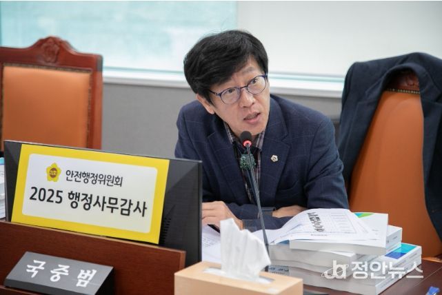 정안뉴스 안정주 기자 | 경기도의회 안전행정위원회 국중범 의원(더불어민주당, 성남4)은 14일 경기도 안전관리실을 대상으로 한 행정사무감사에서 풍수해·지진재해보험 도비 보조금 집행률의 시·군 간 편차가 심각하다고 지적하며, 제도 실효성 제고를 위한 적극적인 대책 마련을 촉구했다.