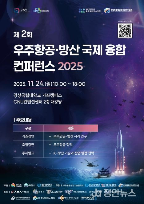 경상국립대학교는 경상남도, 사천시와 공동으로 11월 24일 오전 10시 경상국립대학교 가좌캠퍼스 GNU컨벤션센터에서 ‘제2회 우주항공·방산 국제 융합 콘퍼런스 2025’를 개최한다.