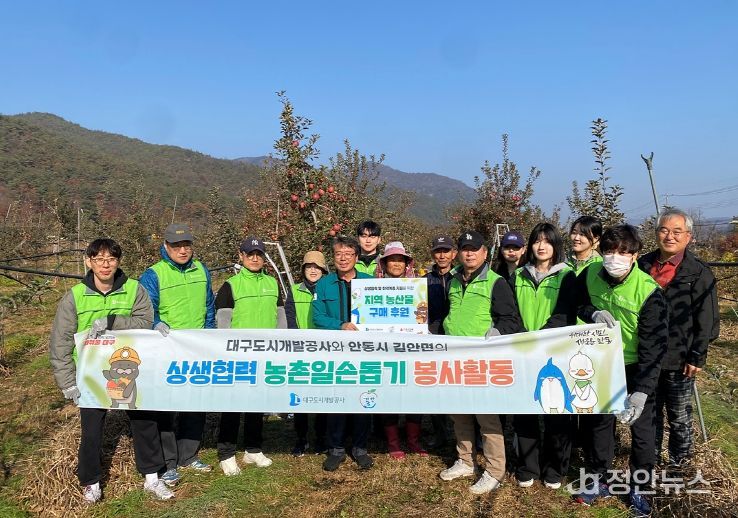 정안뉴스 안정주 기자 | 대구도시개발공사는 지난 11월 14일 안동시 길안면에서 수확철 농가의 인력 부족 해소와 지역 상생을 위해 사과 농가 일손돕기 봉사활동을 진행했다.