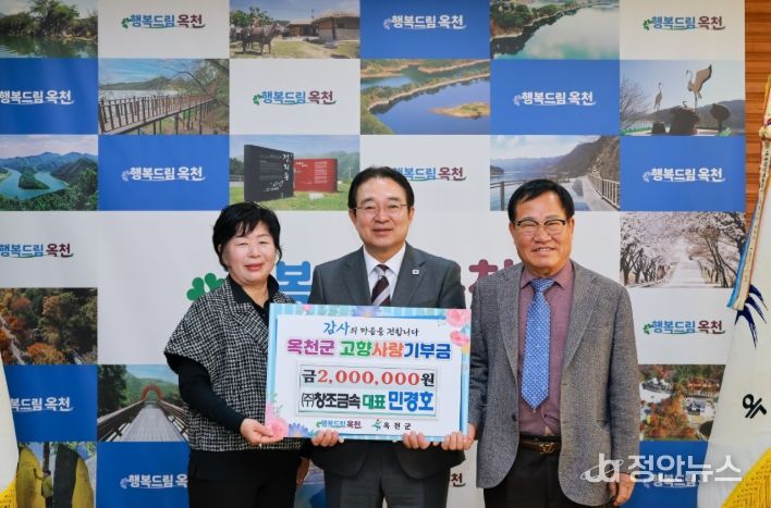 정안뉴스 황은경 기자 | 옥천군 관내 기업 ㈜창조금속 민경호 대표가 지난해와 마찬가지로 고향사랑기부금 200만 원을 기탁하며 옥천의 발전을 응원했다.