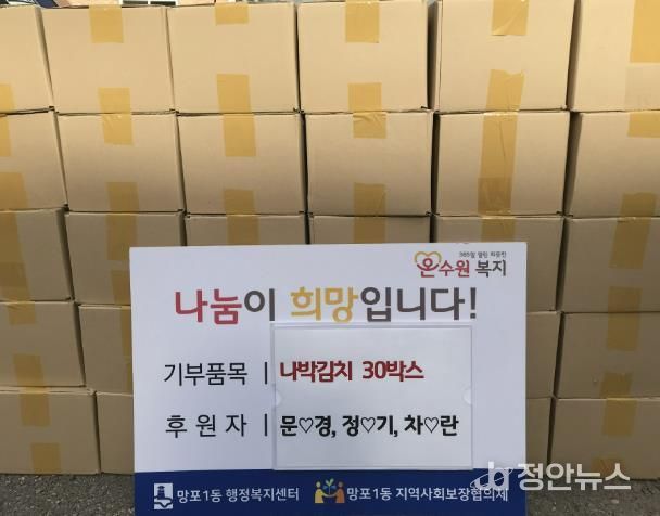 정안뉴스 안정주 기자 | 수원시 영통구 망포1동행정복지센터는 지난 17일, 망포1동 주민 3명이 저소득 취약계층을 위해 나박김치 30박스를 후원했다고 밝혔다.